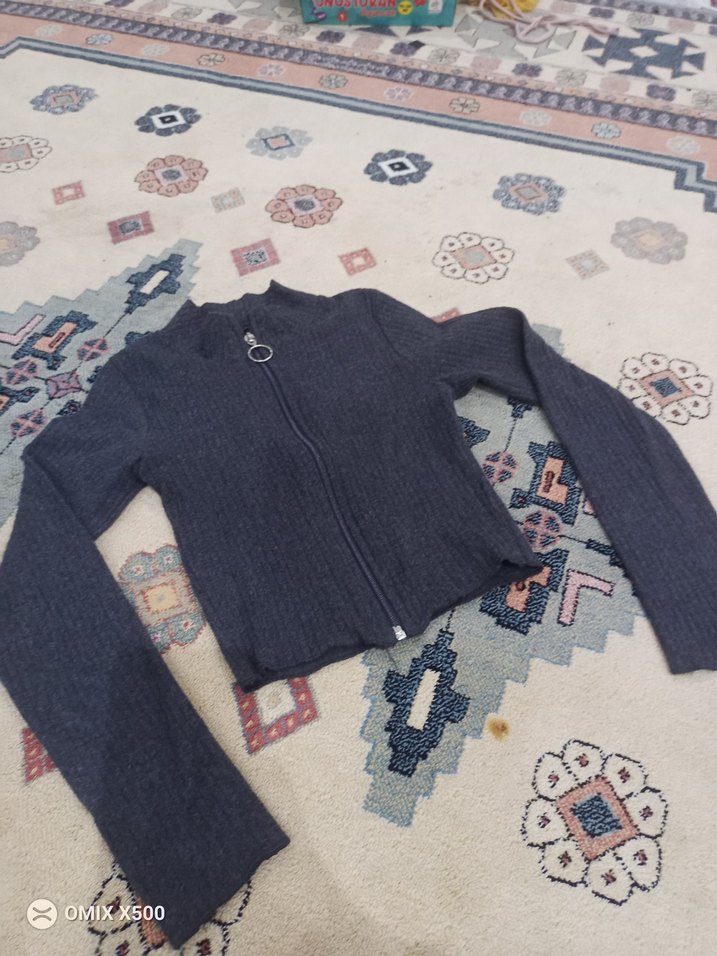Gri renkte, yüksek yakalı, uzun kollu, triko denim kumaştan yapılmış, fitted kesim kadın hırka. Önden fermuarlı, günlük kullanıma uygun rahat bir tasarım.