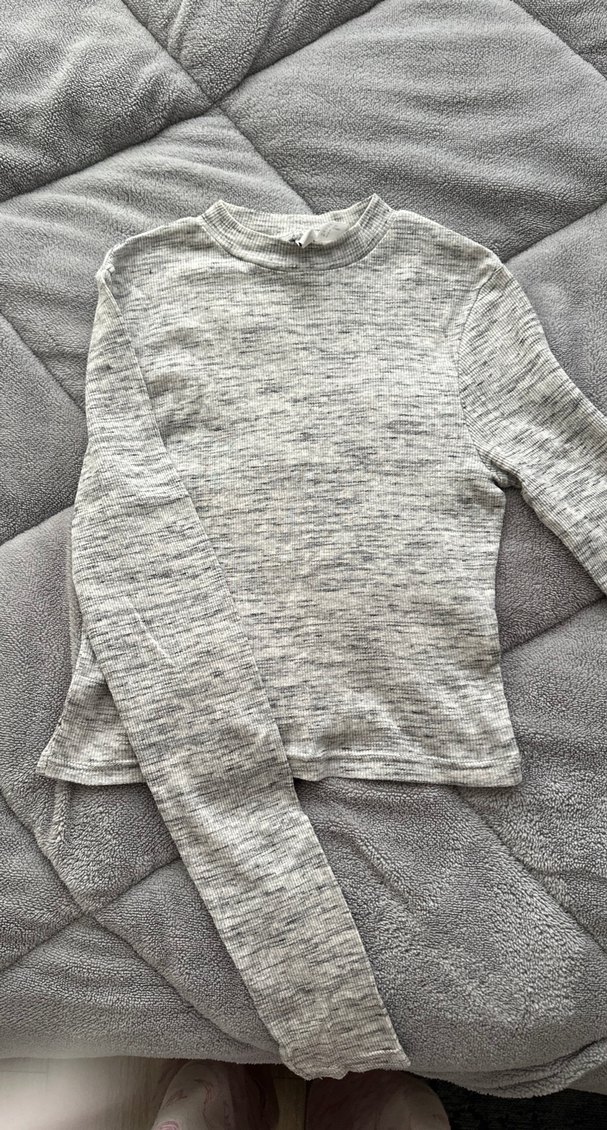 Gri tonlarda, uzun kollu ve yüksek yakalı, ince triko dokulu kadın kazak. Rahat ve şık, gündelik sokak stili için ideal.