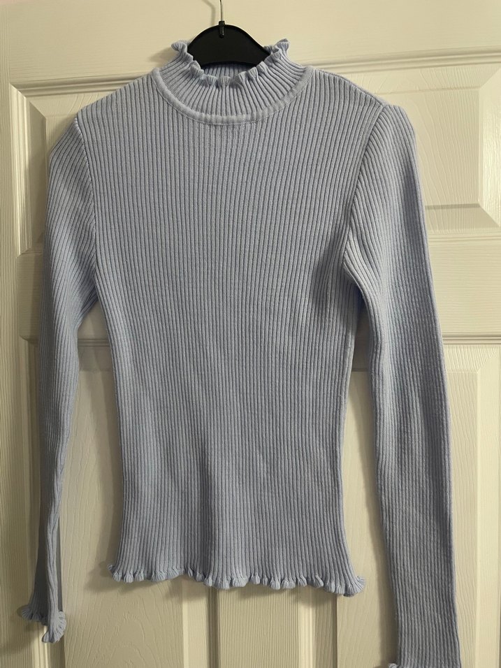 kadın triko kazak, uzun kollu ve yüksek yakalı olup yumuşak, örgü kumaştan mavi renktedir. Normal uzunlukta ve hafif fırfırlı kenarlara sahiptir, rahat günlük kullanım için uygundur sıfır ürün