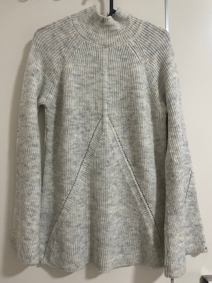 Gri renkli, yüksek yakalı, uzun kollu ve bol kesim kadın trikodan yapılmıştır. Rahat ve normcore tarzıyla günlük kullanıma uygundur. İyi durumda