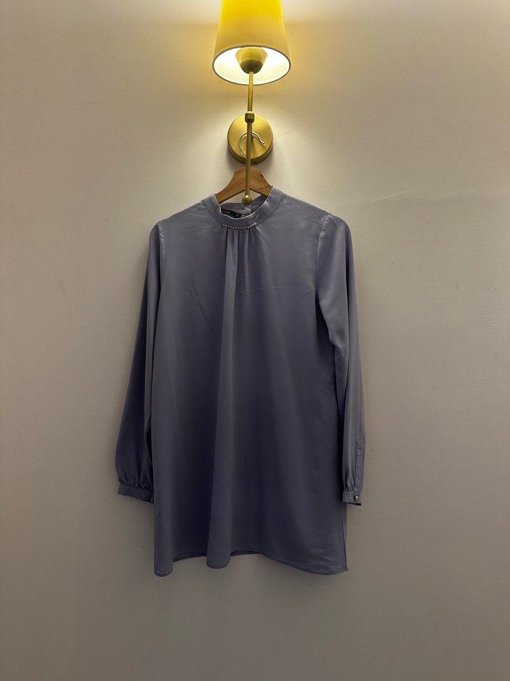Gri midi tunik, yüksek yakalı ve uzun kollu, ipeksi kumaştan, rahat ve şık bir kesime sahip, klasik ofis tarzı için ideal.