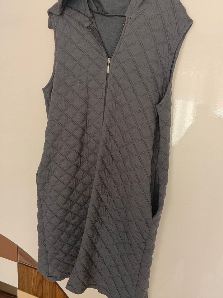 Yüksek yakalı ve fermuarlı önü olan kolsuz kadın yeleği. Sentetik kumaştan, kapitone dokulu, bol kesim ve midi boyda, günlük rahat kullanım için uygundur.