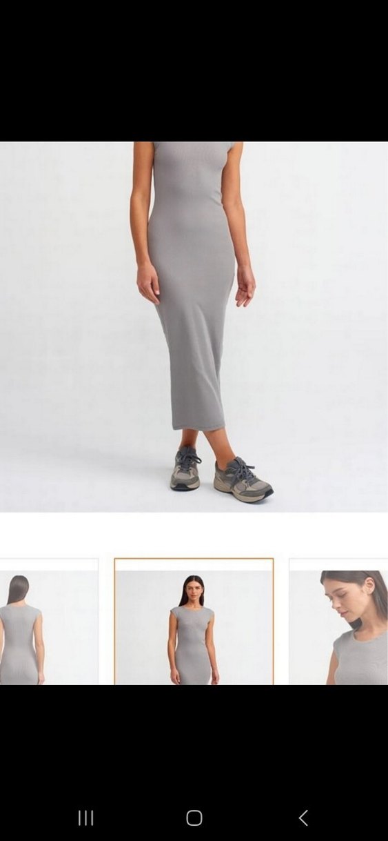 Gri renkli, kolsuz midi elbise, yüksek yakalı ve vücuda oturan kesime sahiptir. Günlük kullanım için pürüzsüz sentetik kumaştan üretilmiştir. Trendy ve rahat bir stil sunar.