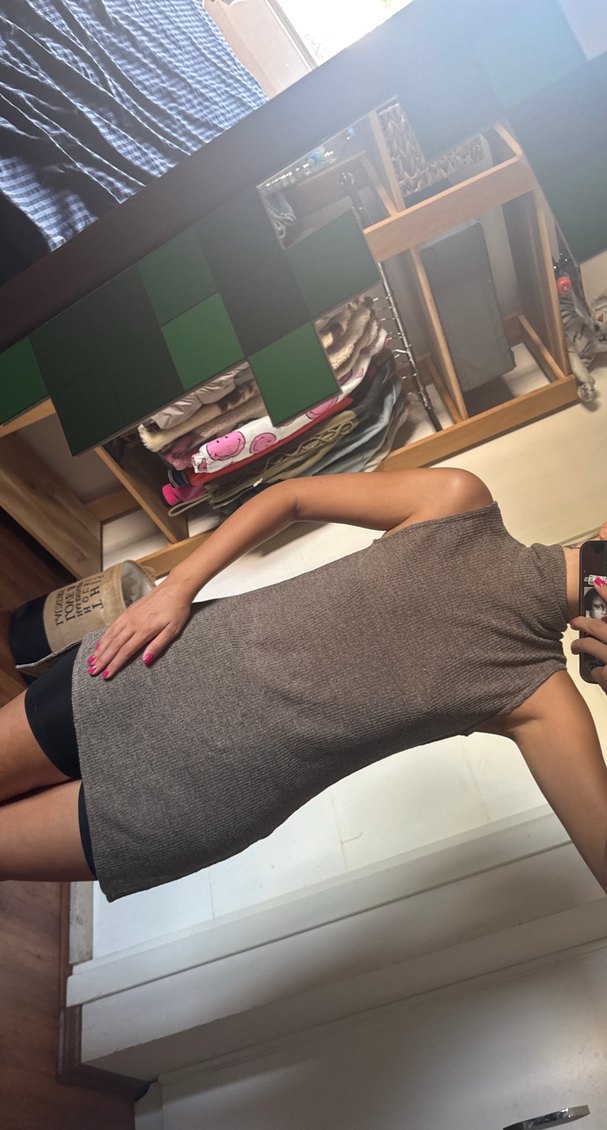 Gri renkte, kolsuz ve yüksek yakalı triko elbise. Yumuşak sentetik kumaştan üretilmiş, midi boyda ve vücuda oturan kesimiyle günlük rahat şıklık sağlar.