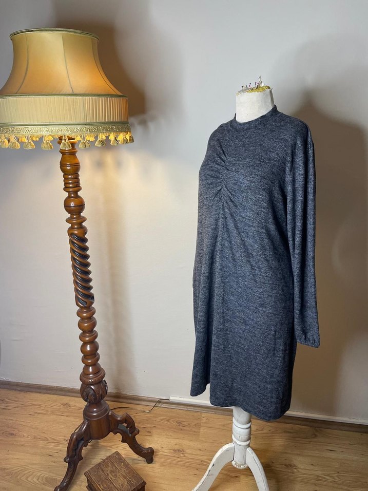 Gri midi triko elbise, yüksek yakalı ve uzun kolludur. Yumuşak keten kumaştan üretilmiş, bol kesim ve drapeli detaylara sahiptir. Günlük kullanım için uygundur.