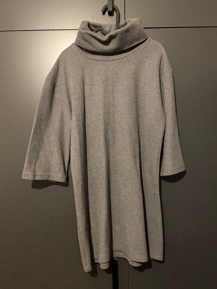 Gri mini triko elbise, yüksek yakalı ve kısa kollu, yumuşak ve sıcak kumaştan, bol kesim ve drapeli tarzda rahat bir görünüm sunar.