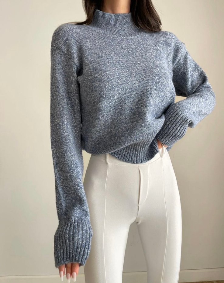 Gri örgü kumaştan, yüksek yakalı ve uzun kollu, bol kesim rahat ve günlük kullanıma uygun kadın kazak.