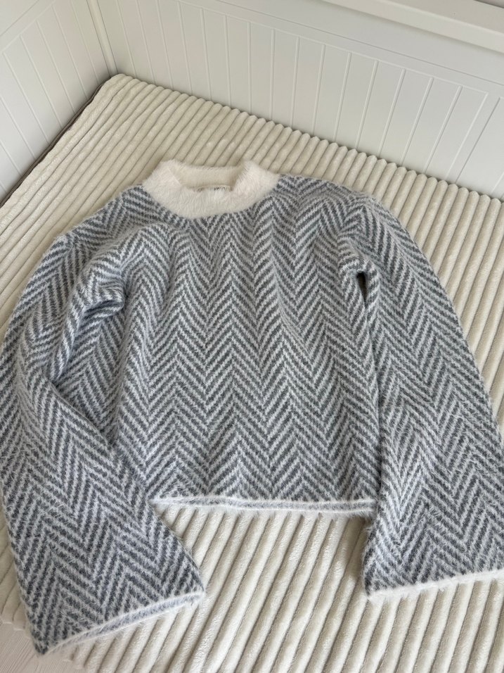 Yüksek yakalı, uzun kollu ve bol kesim kadın kazak. Yumuşak örgü kumaştan, gri balıksırtı desenli, rahat midi uzunluğunda, günlük kullanıma uygun.