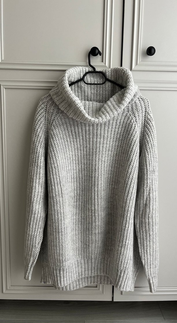 Gri renkli, yüksek yakalı ve uzun kollu örgü kazak. Gevşek kesimi ve midi boyuyla rahat bir kullanım sunar. Günlük kullanıma uygundur.