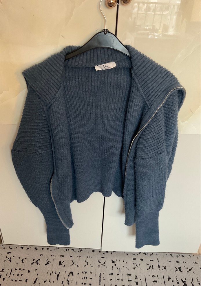 Gri renk, yüksek yakalı ve uzun kollu örgü kazak. Normal midi boyda, rahat ve desensiz, günlük sokak stili için uygun.