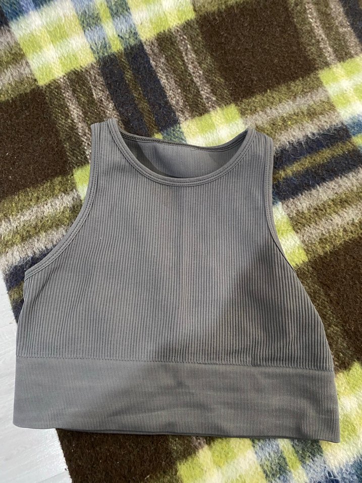 Gri renkli, yüksek yakalı ve örme dokulu, sentetik kumaştan yapılmış, kolsuz ve vücuda oturan spor kadın yeleği. Rahat ve şık sokak stili için uygun. ♀️