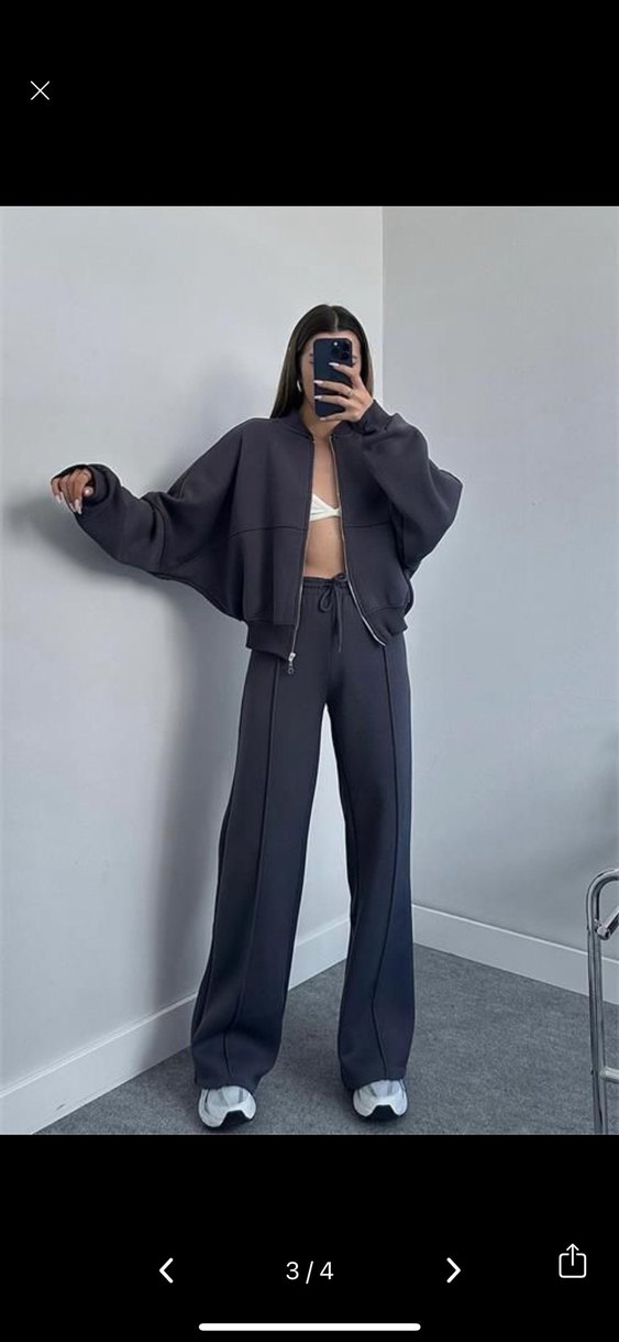 Gri renkte, yüksek yakalı ve uzun kollu salaş kesim kadın eşofman takımı. Yumuşak ve sıcak kumaştan üretilmiş, günlük kullanıma uygun rahat ve şık bir modeldir.