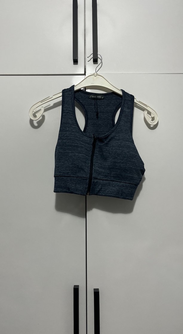 Gri renkte, yüksek yakalı ve cırt cırtlı kapamalı, sentetik kumaştan yapılmış, kısa ve vücuda oturan spor crop top. ️♀️