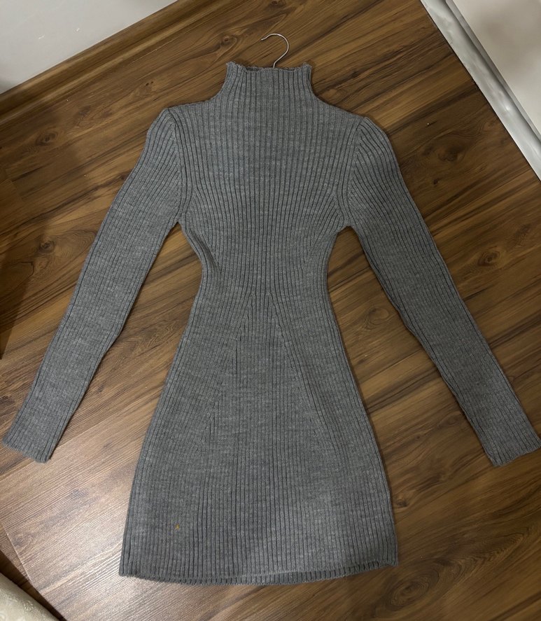 Gri renkli, yüksek yakalı ve uzun kollu triko elbise, mini boyda ve belden oturan vücuda kesime sahiptir. Rahat ve desen içermeyen tasarımı günlük kullanıma uygundur. Standart bedendir