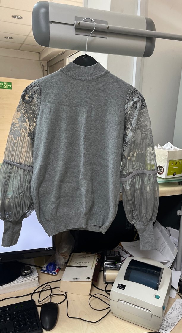 Yüksek yakalı, uzun ve desenli transparan kollu, triko kumaştan yapılmış, bol kesim ve normal boyda kadın kazak fransa markasıdır hiç kullanılmamıştır