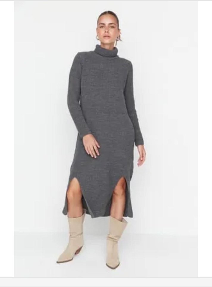 Gri Yüksek Yakalı Triko Uzun Elbise