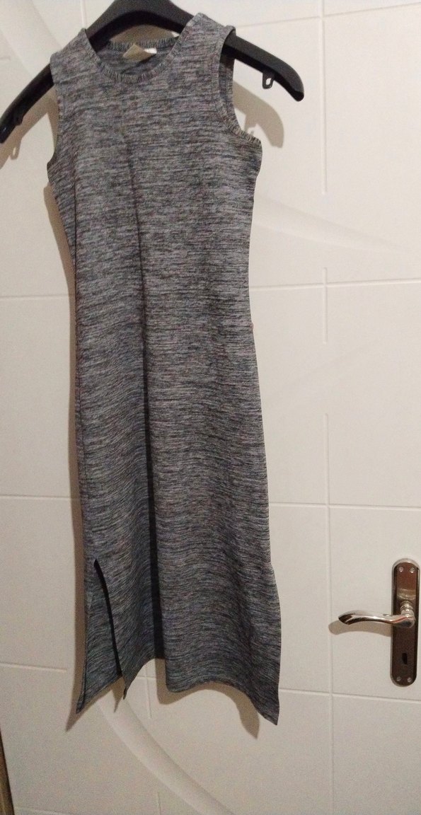 Yüksek yakalı, kolsuz, yan yırtmaçlı gri uzun elbise, yumuşak sentetik kumaştan. Rahat ve şık, günlük sokak stili için uygun.