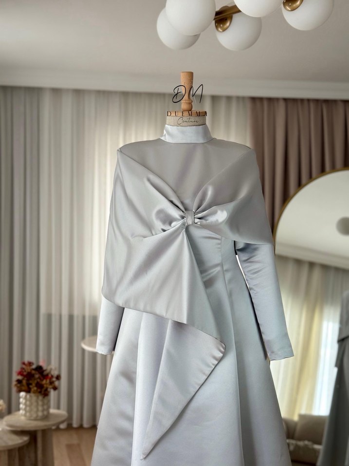 Gri renkte, uzun kollu ve yüksek yakalı nişan elbisesi. Drape detayları ve regular kesimiyle çağdaş ve avangard tarzda tasarlanmıştır.