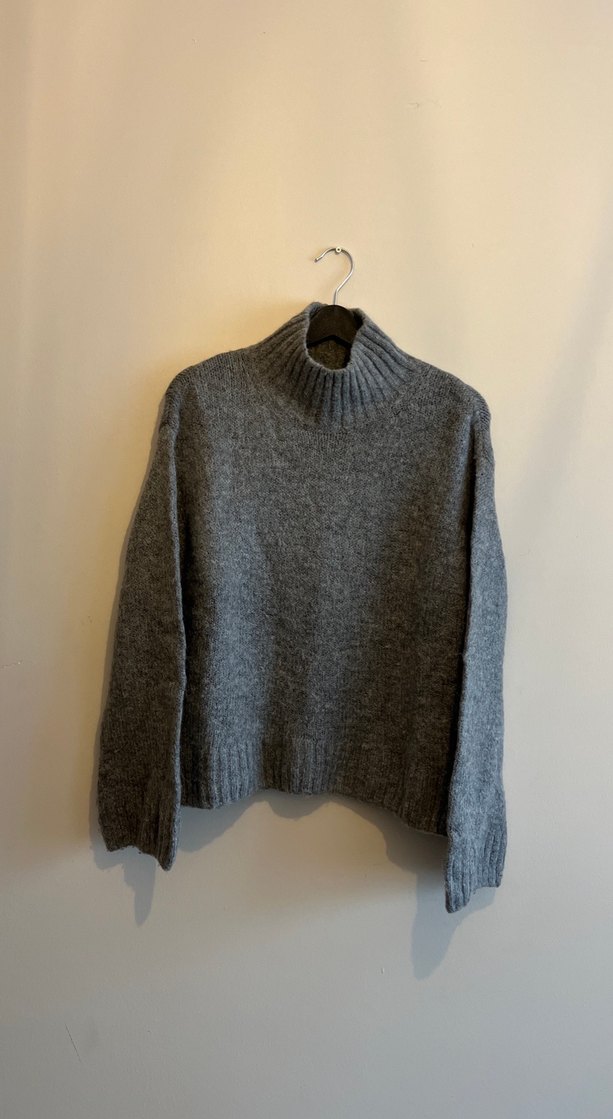 Gri renkli, yüksek yakalı örgü kadın kazak. Uzun kollu, bol kesim ve normal boyda, yumuşak örgü kumaştan üretilmiştir. Düz ve desensiz tasarımı günlük kullanıma uygundur.