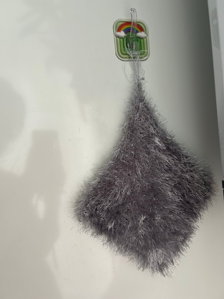 Gri renkli, yumuşak ve kabarık dokulu banyo süngeri. Kolay asmak için bir askı halkasına sahiptir. Bebekler için bebek lifi yeni ördüm