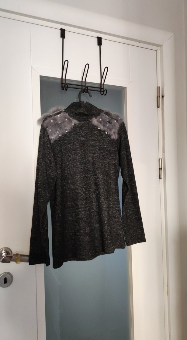 Gri renkli, balıkçı yaka ve uzun kollu, omuzlarında kürk detayları bulunan, rahat ve fit kesimli goth tarzı triko kazak.