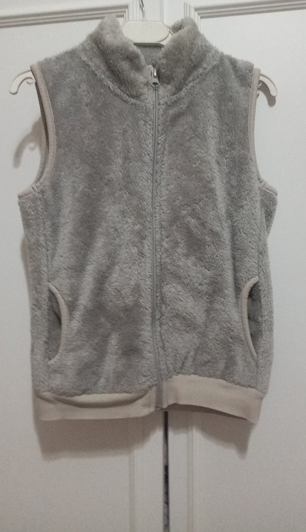 Yüksek yakalı, kürk detaylı, gri yumuşak dokulu kolsuz yelek. Fermuarlı ve vücuda oturan kesimiyle günlük rahat sokak stiline uygun.