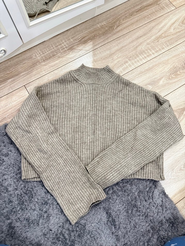 Gri yün örgü kazak, boğazlı ve uzun kolludur. Salaş kesimi, desensiz sade tasarımı ve normal boyu ile günlük kullanıma uygundur.