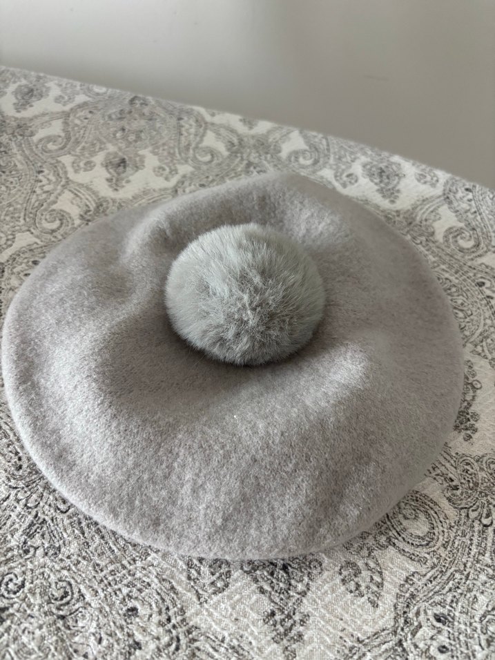 Yumuşak yün kumaştan yapılmış gri çocuk bere, üstünde kürk detaylı ponpon bulunur. Modern klasik tarzı, bohem ve retro dokunuşlarla birleştirir.