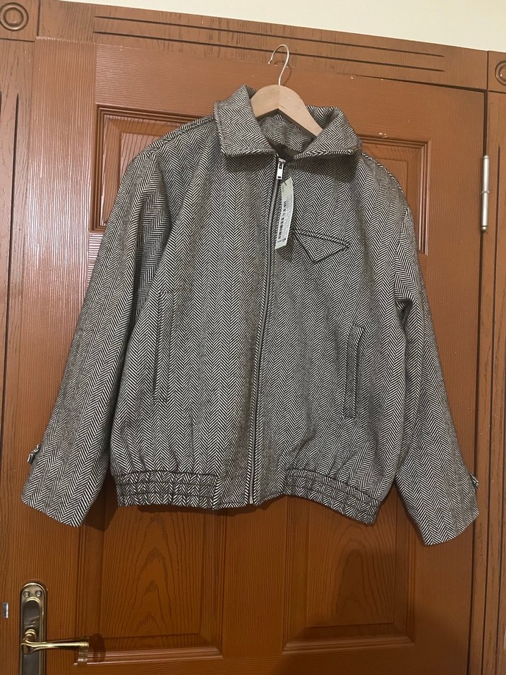 Gri yün kumaştan yapılmış, fermuarlı ve kesik yakalı kadın ceket. Uzun kollu, normal kesim, günlük rahat kullanıma uygun.