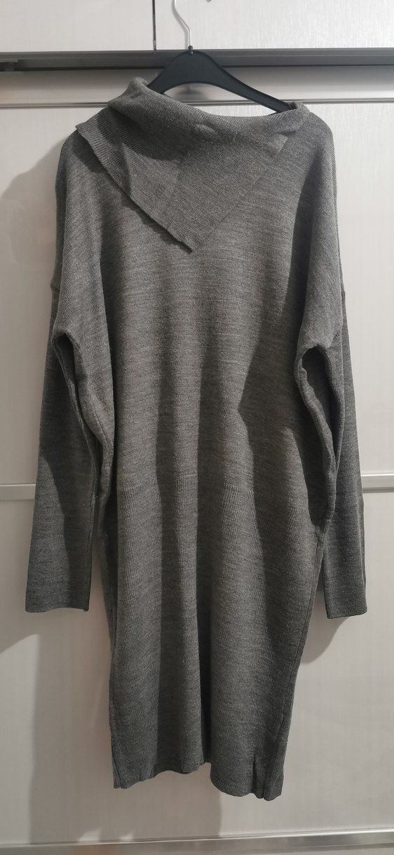 Kadınlar için gri yün kazak, yarım boğazlı ve uzun kolludur. Örgü dokusuyla rahat ve bol kesimdir, midi boyda günlük kullanım için uygundur.