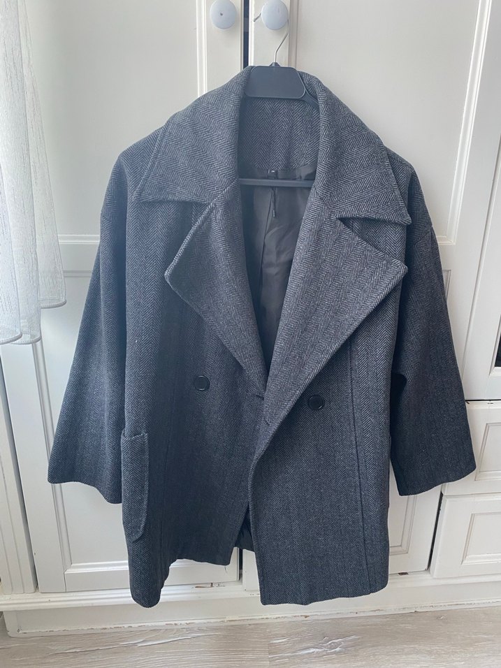Geniş yakalı, çift düğmeli, büyük cepli gri kaban. İç kısmı yumuşak astarlı, kalın ve sıcak tutan kumaştan yapılmıştır.
