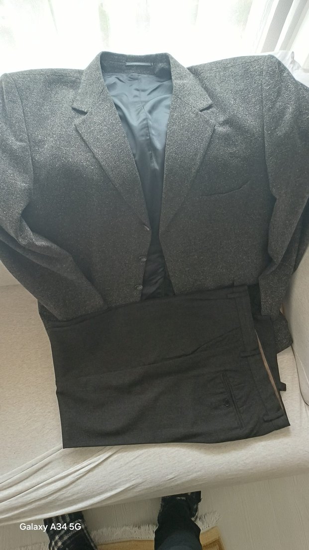 Bu gri erkek takım elbise, normal kesim ve normal uzunluktadır. Düğmeli ve yakası kesik, yün kışlık ceket arkadan yırtmaçlı uzun kolludur, ofis için uygundur.
