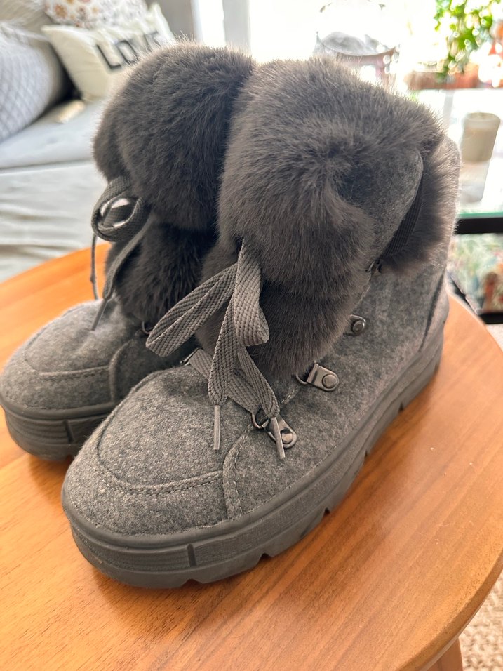Gri yün kumaştan yapılmış, kürk detaylı ve dolgu topuklu kadın botları. Nakış desenleri ve rahat tasarımıyla dış mekan kullanımı için uygundur. ❄️