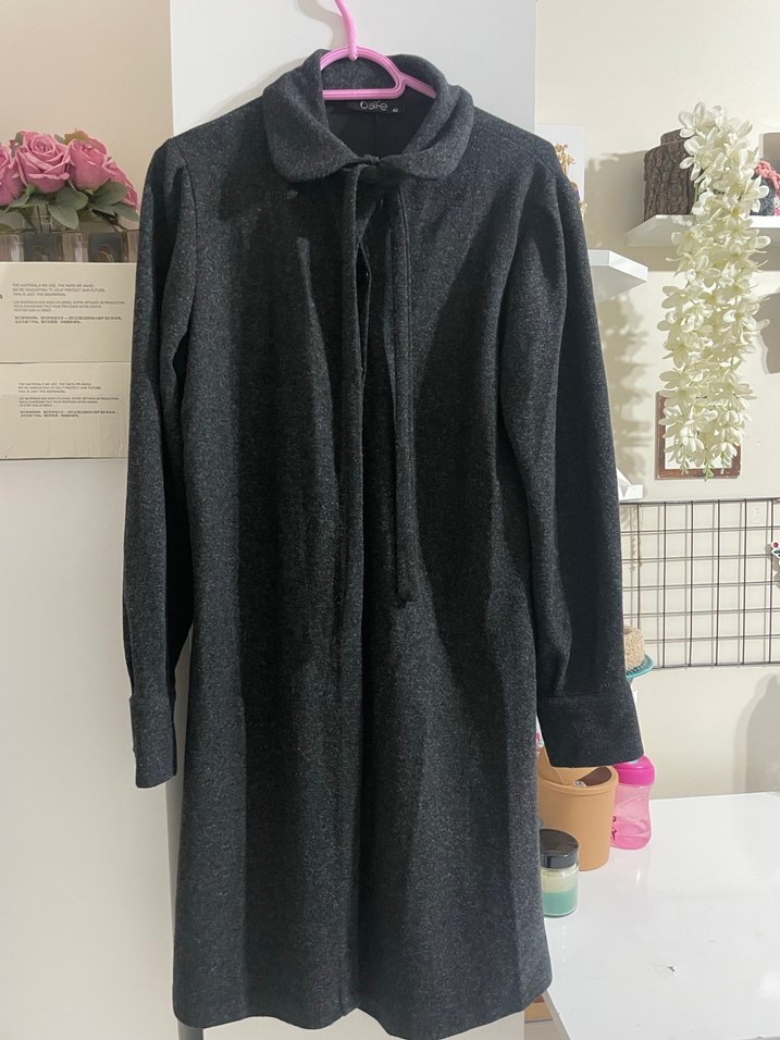 Gri yün midi kaban, düğmeli ve kesik yaka detaylıdır. Uzun kollu ve rahat kesim, ofis için şık ve konforlu bir tercihtir.