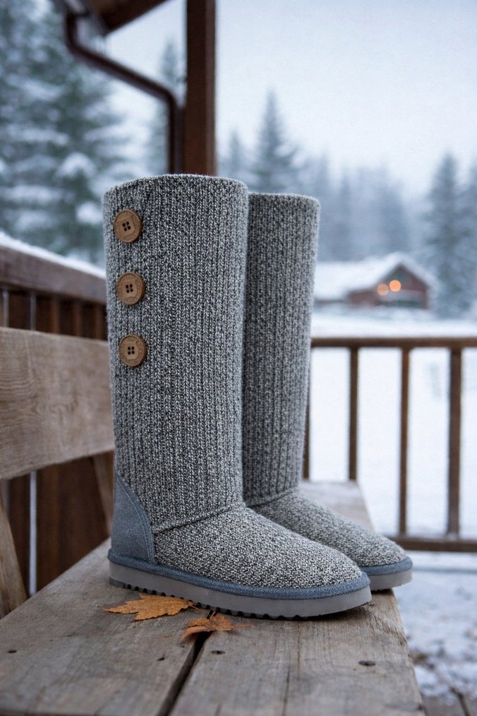 Gri yün örgü malzemeden yapılmış, dolgu topuklu ve ahşap düğme detaylı, günlük kullanıma uygun rahat bohem tarzda botlar.