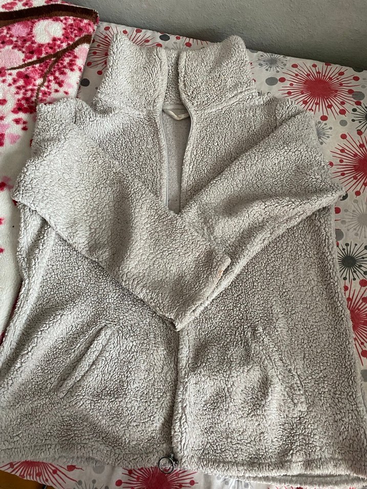 Kadınlar için yüksek yakalı, uzun kollu, gri renkte, yumuşak ve sıcak kumaştan yapılmış, kürk detaylı, rahat ve şık polar ceket. Günlük kullanıma uygundur.