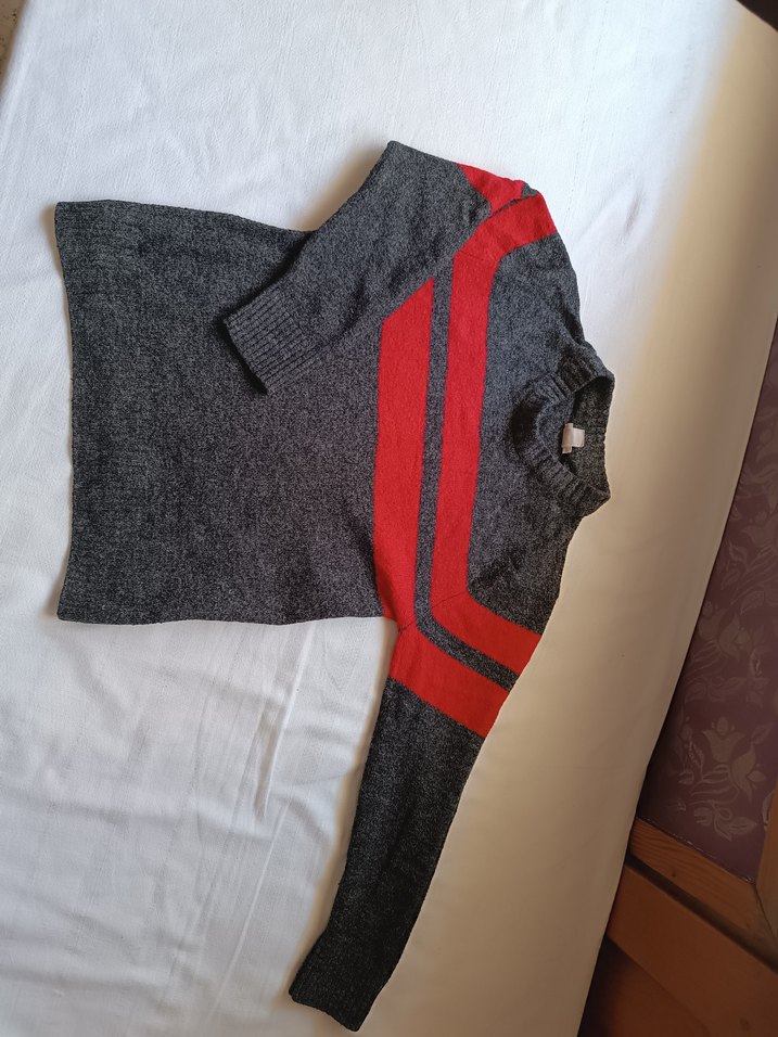 Gri ve kırmızı çizgili, yumuşak yünden örülmüş, yüksek yakalı ve uzun kollu, triko kazak.