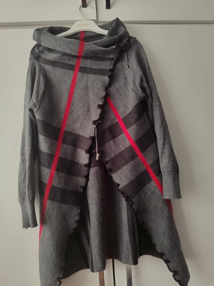Gri yün kumaştan, uzun kollu, bol kesim ve yakası drapeli hamile kaban. Kırmızı ve siyah çizgili deseniyle günlük sokak stiline uygun.