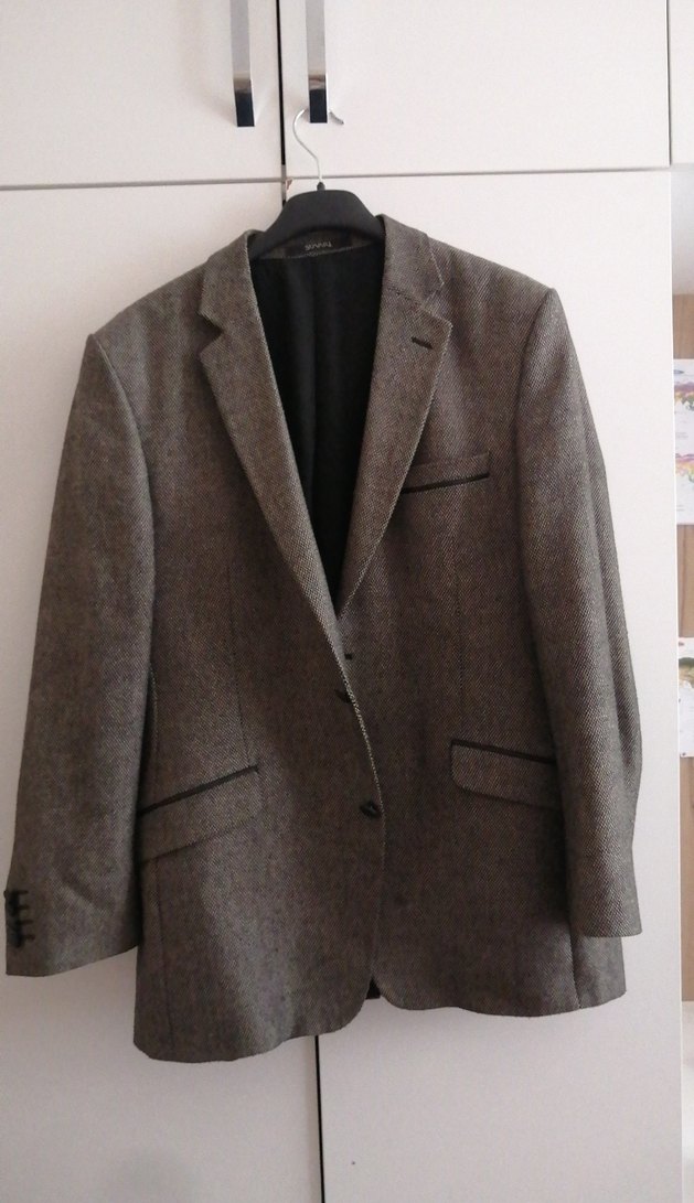 Gri yün kumaştan, düğmeli ve kesik yakalı erkek ceket. Normal boy, regular fit ve uzun kolludur. Klasik iş stiline uygundur.