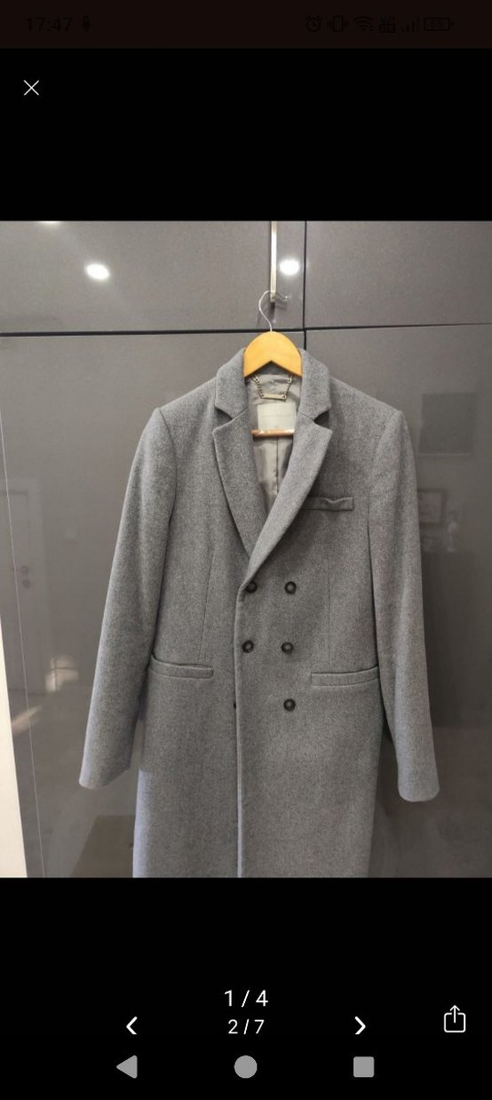 Gri yün kaban, klasik kesim, notched yaka ve düğmeli ön detaylarla ofis kullanımı için uygundur. Uzun kollu ve midi boydadır.