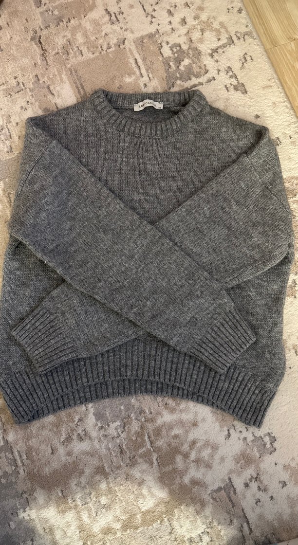 Gri renkte yünlü, örgü kadın kazak. Yuvarlak yakalı, uzun kollu ve bol kesimdir. Sade ve rahat günlük kullanım için uygundur.