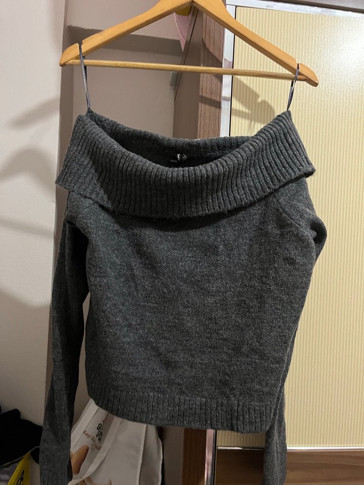 Gri Yünlü Kadın Omzu Düşük Kazak