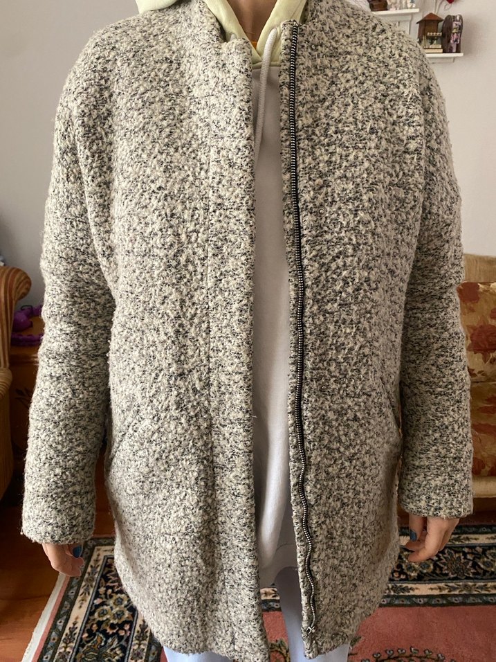 Gri renkte, yün kumaştan yapılmış, kürk detaylı, uzun kollu ve normal uzunlukta, bol kesim Günlük kullanım için uygundur.