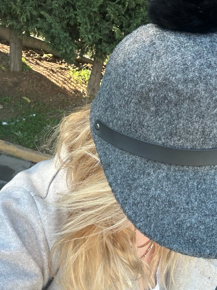 Gri yün malzemeden yapılmış, kürk detaylı ve deri bantlı, rahat ve şık sokak stili kadın şapkası.