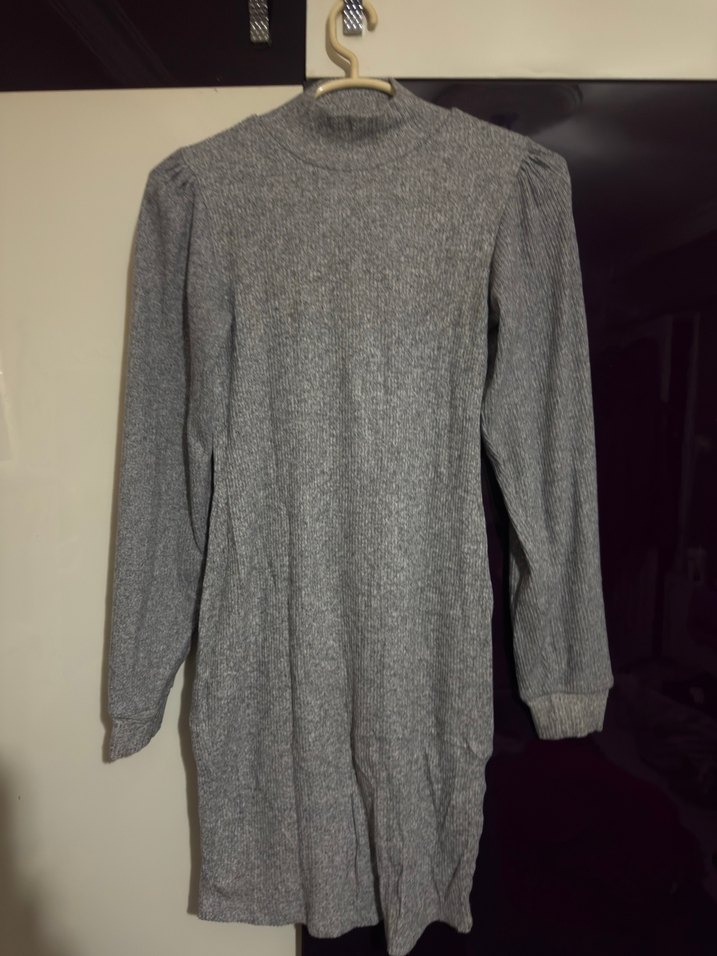 Gri renkte, uzun kollu ve yüksek yakalı, yünlü dokuma midi boy elbisedir. S m uyumlu