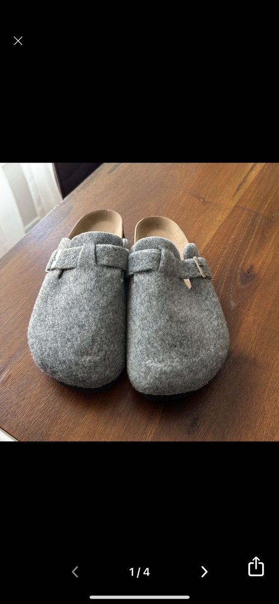 Gri yünlü terlikler tokalı ve kama topukludur, rahat ve sade bir tarz sunar.