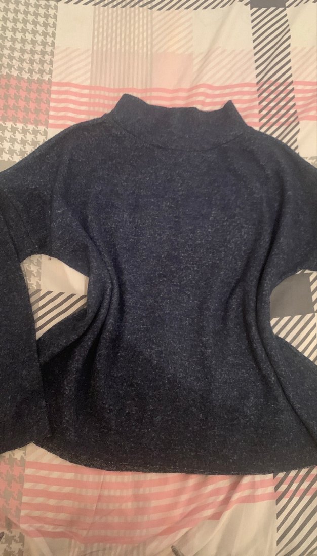 Yüksek yakalı ve uzun kollu, yünlü, lacivertrenkli, normal uzunlukta, rahat kesim kadın kazak. Günlük kullanıma uygun, sade ve sıcak tutar. En 51cm boy53cm