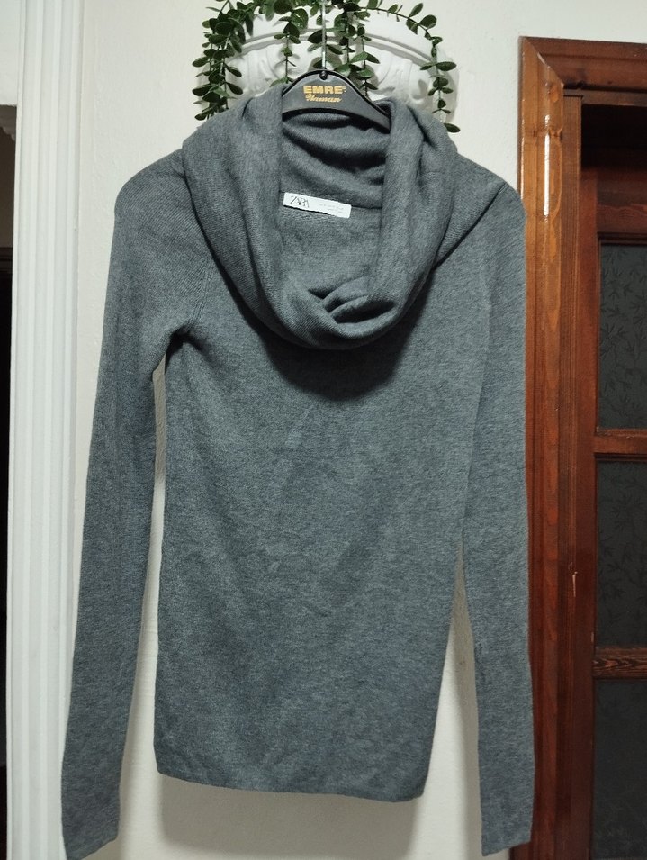 Yün kumaştan yapılmış, yüksek yakalı, uzun kollu ve vücuda oturan gri renkte örme kadın kazak.