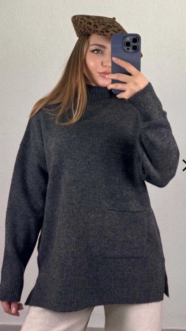 Gri renkte, yün örme kumaştan, yüksek yakalı ve uzun kollu, rahat kesim normcore tarzda günlük kullanıma uygun kadın kazak.