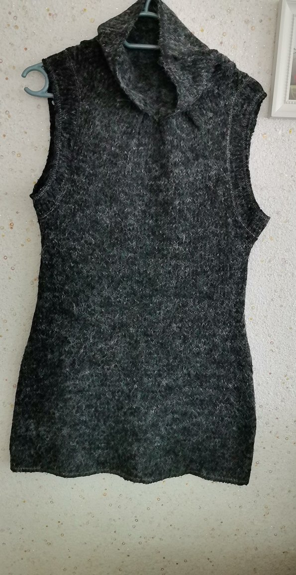 Yüksek yakalı, kolsuz gri yün triko. Vücuda oturan kesimi ve örme dokusu rahat bir kullanım sağlar. Günlük kullanıma uygun midi boyda, desensiz model. Koyu gri kırçıllıdır. Işıktan açık renk çıkmıştır. Hiçbir hatası yoktur. Az kullanılmıştır